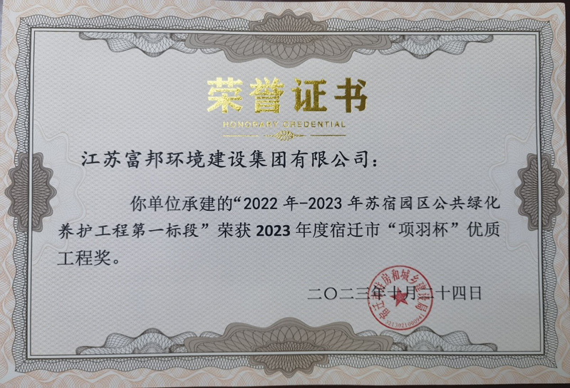 近日,由宿遷市蘇宿園區(qū)建設發(fā)展有限公司負責管理的蘇宿工業(yè)園區(qū)2022-2023年公共綠化養(yǎng)護工程第一、二標段,同時榮獲2023年度宿遷市項羽杯優(yōu)質工程獎。