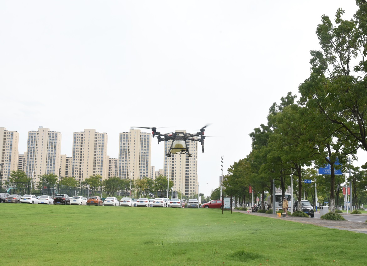 8月21日上午,在園區(qū)中央商務(wù)區(qū)開放綠地,一臺無人機(jī)正在勻速飛行,對中央商務(wù)區(qū)25萬平方米草坪開展病害防治。