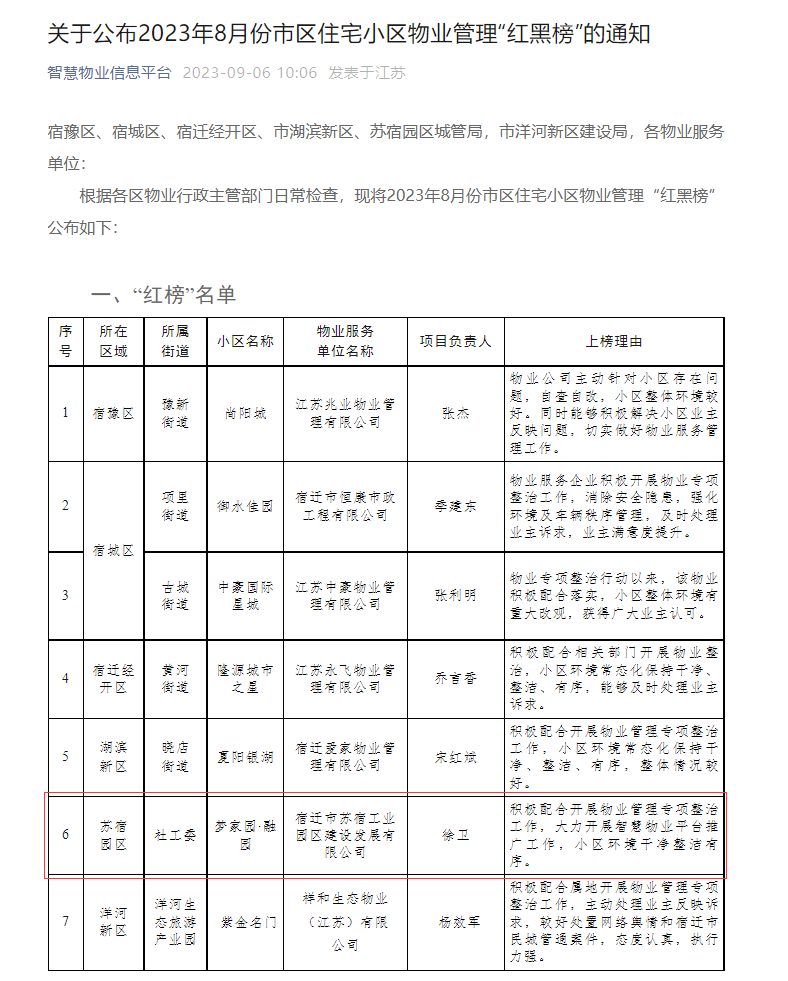 物業(yè)服務好不好,“紅黑榜”上見分曉。8月29日,宿遷市住房和城鄉(xiāng)建設局公布8月份市區(qū)住宅小區(qū)物業(yè)管理“紅黑榜”?,建發(fā)公司夢家園項目物業(yè)服務質量綜合考評“優(yōu)秀”,榮登“紅榜”。